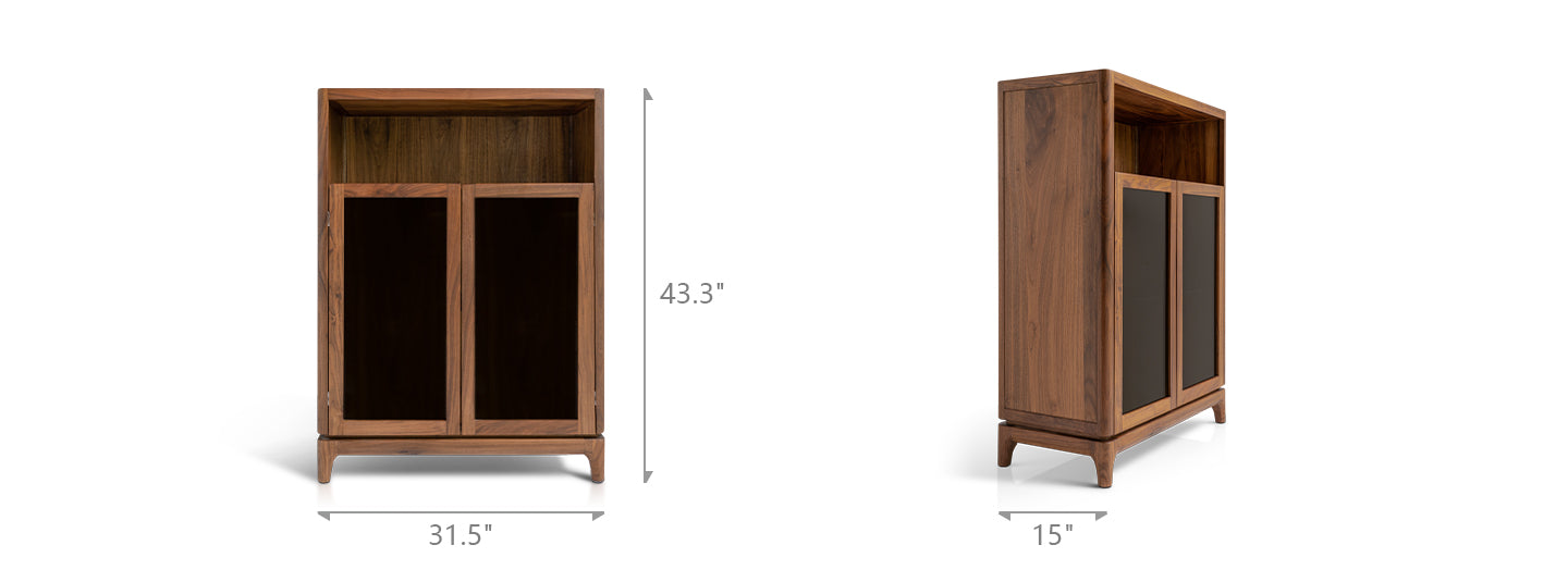 The Plato Storage combines a solid walnut frame for rich color and strength with plywood for added durability. Its natural walnut veneer enhances the cohesive, luxurious design, ensuring both elegance and long-lasting functionality.