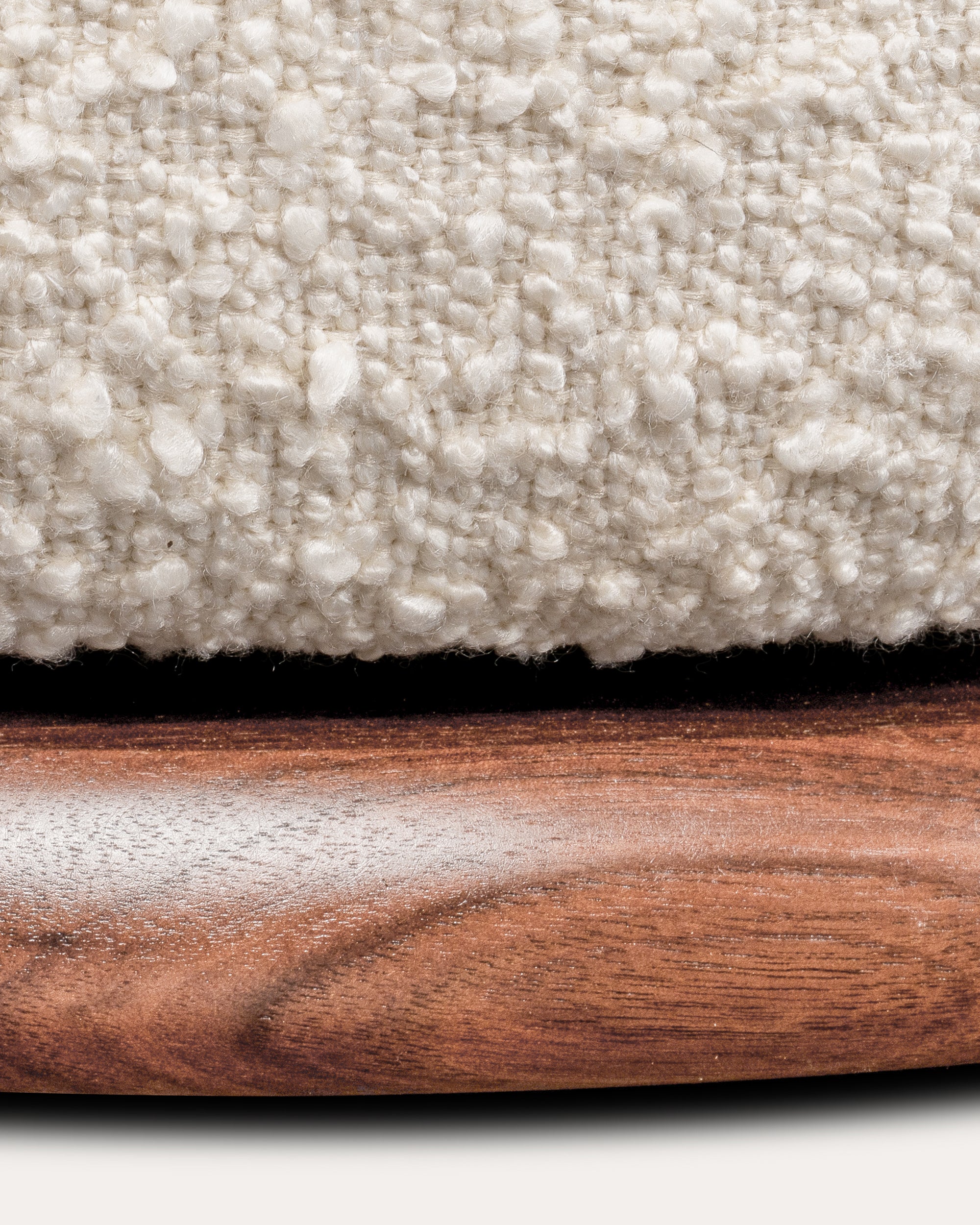Its rounded shape and cozy bouclé fabric create a warm, inviting feel, while the simple design and solid wood base add a natural, elegant touch.