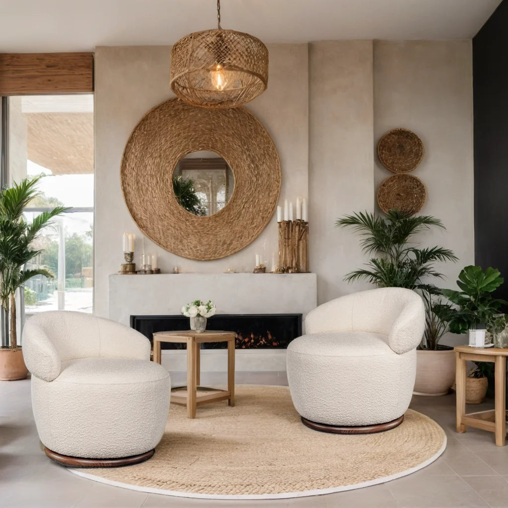 Nest Swivel Bouclé Chair features a round solid ash wood base, comfortable bouclé fabric, and high-density foam padding for a soft, springy seating experience.
