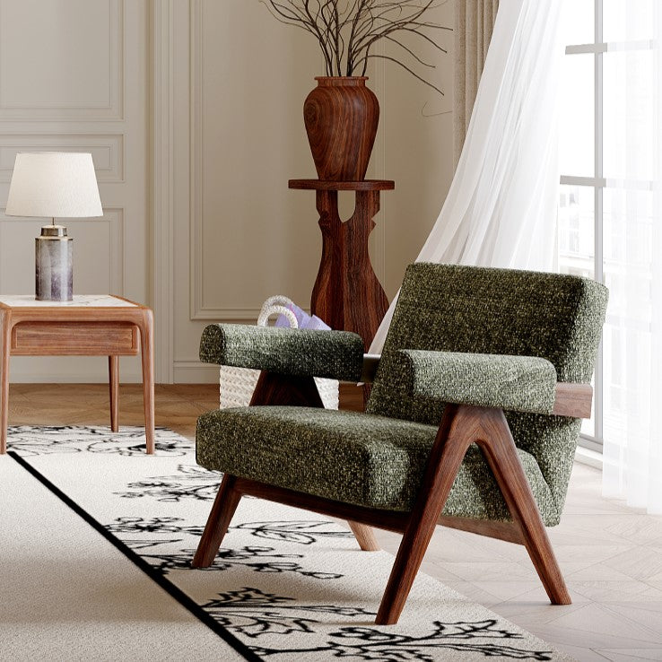 The chair's sloped roll-style plush arms add sophistication, while the backrest and seat boast luxurious upholstery in high-quality fabrics that exude grandeur and luxury. The exceptional fusion of premium materials and exquisite design makes the Enzo Chair an iconic addition to any room.