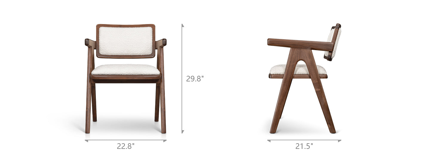 Inspired by a modern retro aesthetic, this chair combines sleek, angular lines with a timeless charm. The boucle fabric adds a trendy, Scandinavian-inspired softness that contrasts beautifully with the rich, natural wood tone. Its armrests and unique cut-out details on the frame make it a statement piece, perfect for both dining rooms and home offices.