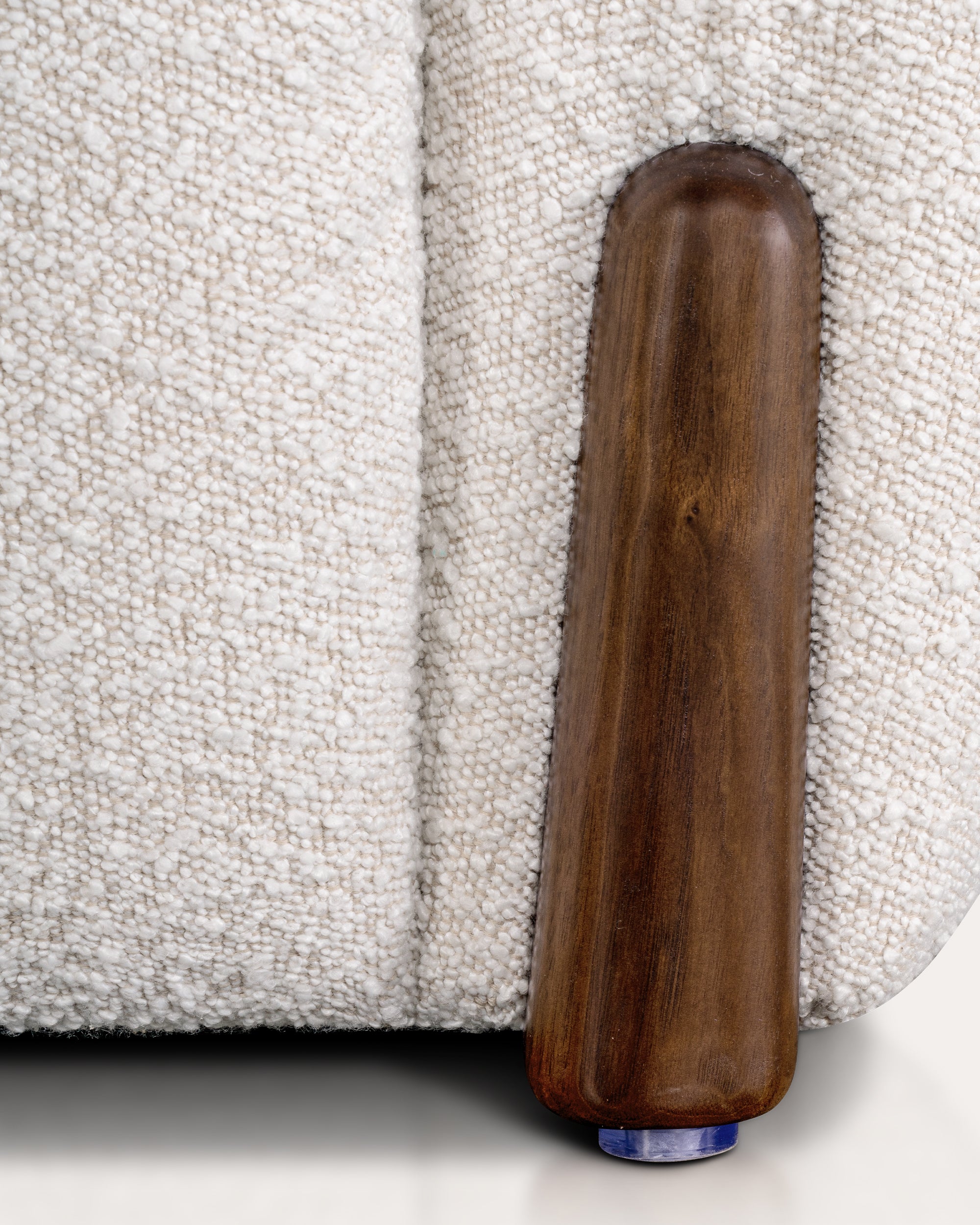Featuring solid ash wood legs with a walnut-colored finish, treated with imported wood wax oil for a premium touch. The upholstery is made of boucle fabric, adding a layer of comfort and texture.